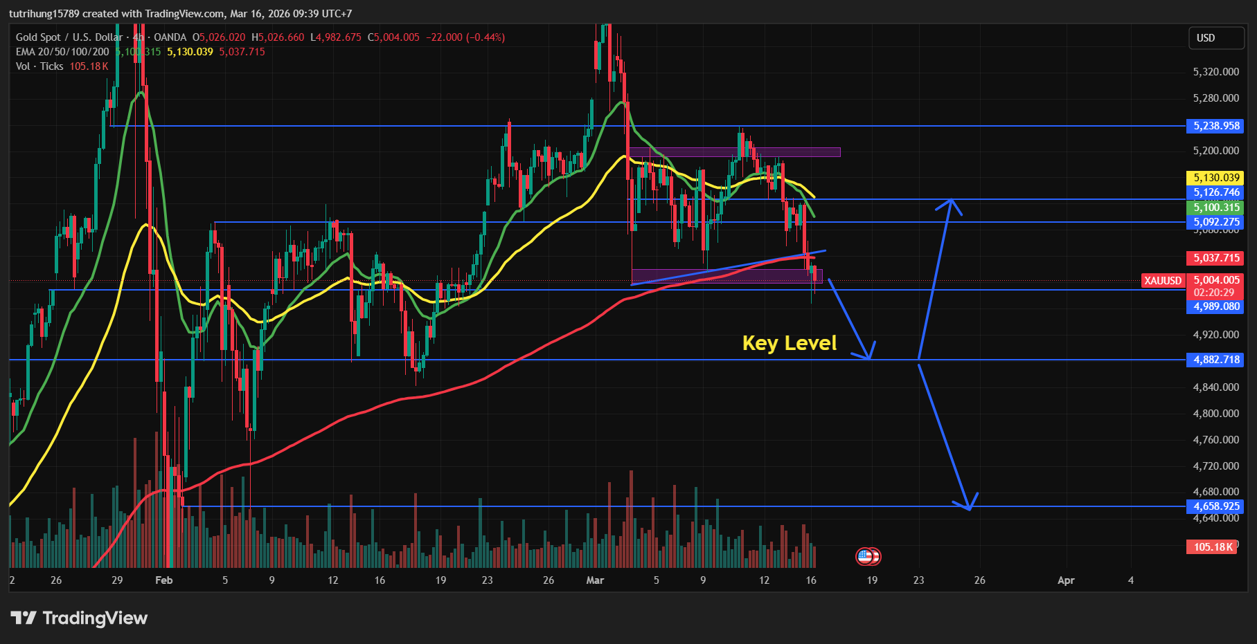 Trong tuần này, khả năng cao giá Vàng sẽ tiếp tục chịu áp lực bán mạnh về dưới vùng 4880$/ounce và dòng tiền sẽ đẩy mạnh vào Dầu đưa giá Dầu lên hơn 100$/thùng.